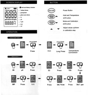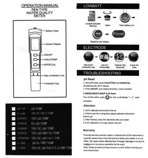 TDS (Total oppløste faste stoffer): Måleområde 0-10000 ppm eller 10.1 - 200.0 ppt / Oppløsning 01.ppm eller 01. ppt / Nøyaktighet ±2% av fullskalaområdet