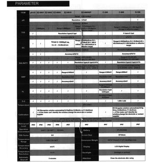 EC (Elektrisk ledeevne): Måleområde 0-10000µS/cm eller 10.10-19.99 mS/cm eller 20.1-400 mS/cm / Oppløsing 1 µS/cm eller 0.1 mS/cm / Nøyaktighet ±2% av fullskalaområdet