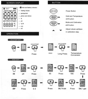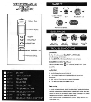 TDS (Total oppløste faste stoffer): Måleområde 0-10000 ppm eller 10.1 - 200.0 ppt / Oppløsning 01.ppm eller 01. ppt / Nøyaktighet ±2% av fullskalaområdet