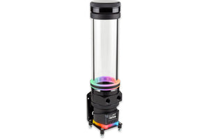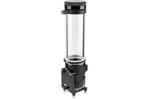 Utvendige sortanodiserte aluminiumsringer er festet til begge ender av glassrøret. Aluminiumsringene har ikke kontakt med kjølevæsken. Pumpeadapter og lokk er laget av det sterke materialet acetal. Skru av lokket og du har en stor åpning for påfylling av kjølevæske.