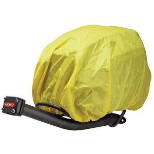 Bærehåndtak og regntrekk. Bak er det reflekstripe og feste for baklys.
