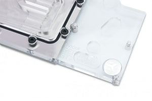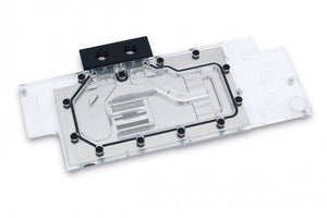 Denne vannblokken kjøler GPU, RAM og VRM. To 3mm hull for LED. For å koble sammen flere vannblokker benyttes EK-FC Terminal broer.