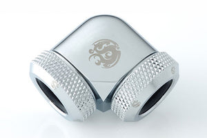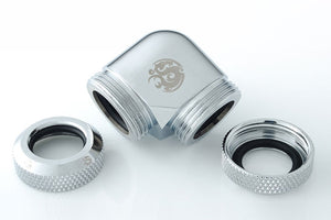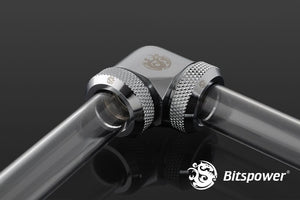 Vinklet 90° adapter for sammenkobling av 2 stk. ø12mm rør. Som de andre kvalitetsproduktene fra Bitspower har den en førsteklasses finish.